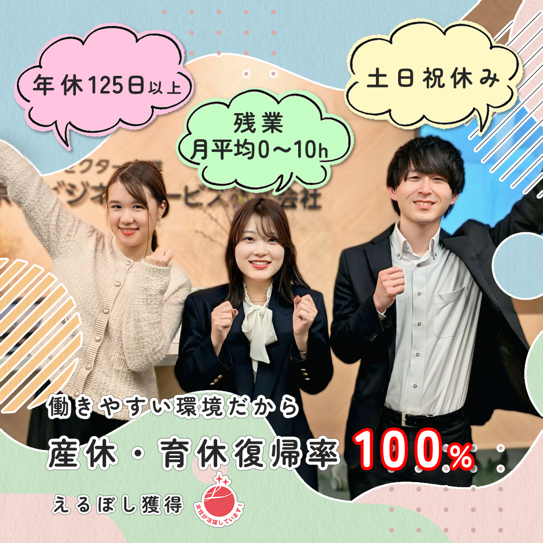 当社はえるぼしマークを取得しております。産休・育休からの復職率100%、時短勤務制度の活用実績もございます。ライフイベントに寄り添った、働き続けやすい環境を実現しています。https://www.tokyotobs.co.jp/news/4517/